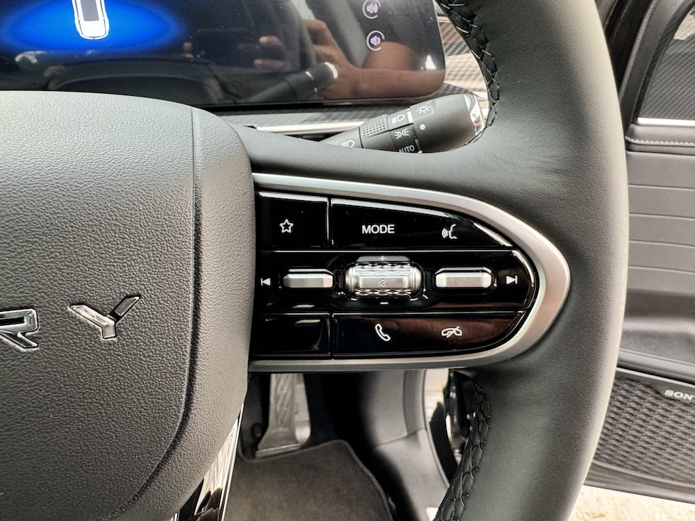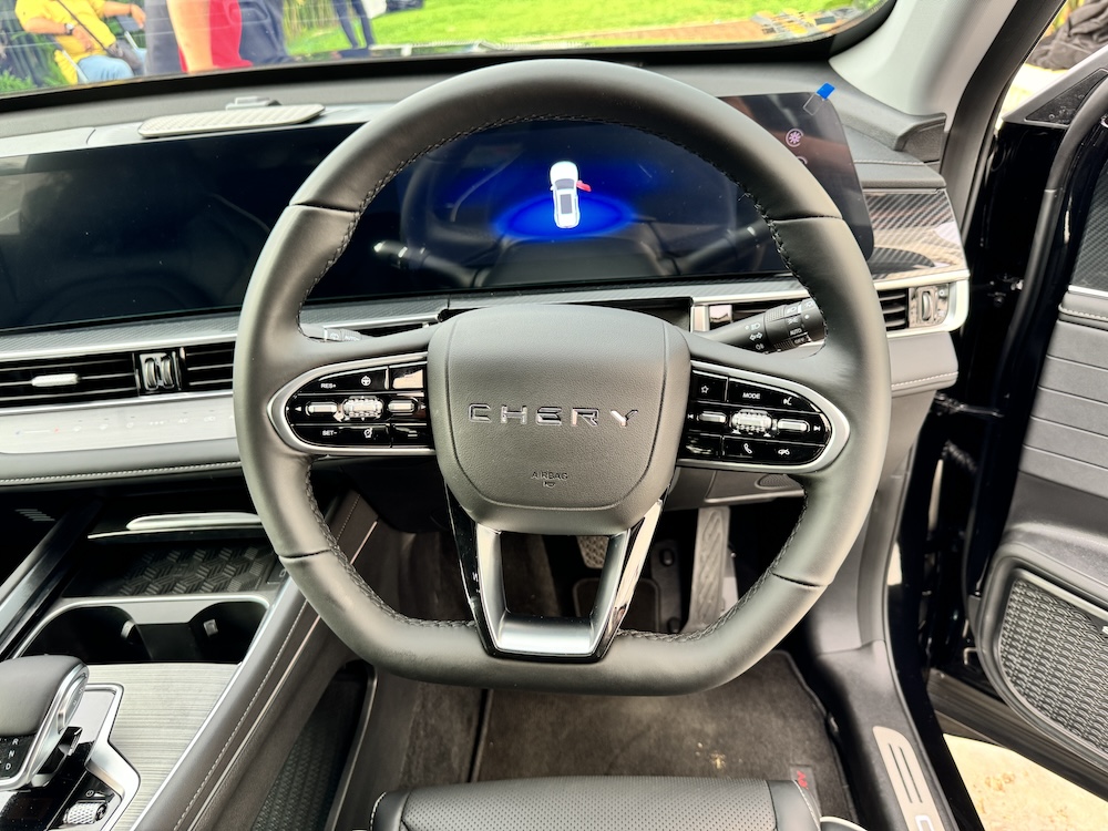 - Kerusi dan stereng menggunakan material kulit tiruan (leatherette) dengan kluster butang kawalan pada stereng.