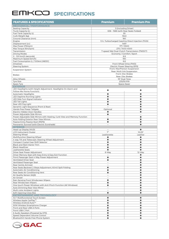 GAC Emkoo 2025 dijana enjin 1.5TGDI berkuasa 177ps dan tork 270Nm dengan transmisi dual-klac (DCT) 7-kelajuan (jenis basah) yang memberikan pecutan 0-100kmj sepantas 8.8 saat dengan kelajuan maksimum 190kmj.