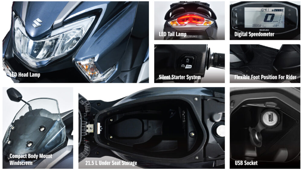 - Kapasiti storan bawah pelana 21.5 liter dengan dua cangkuk helmet, dan dua cangkuk utiliti untuk barangan tambahan.