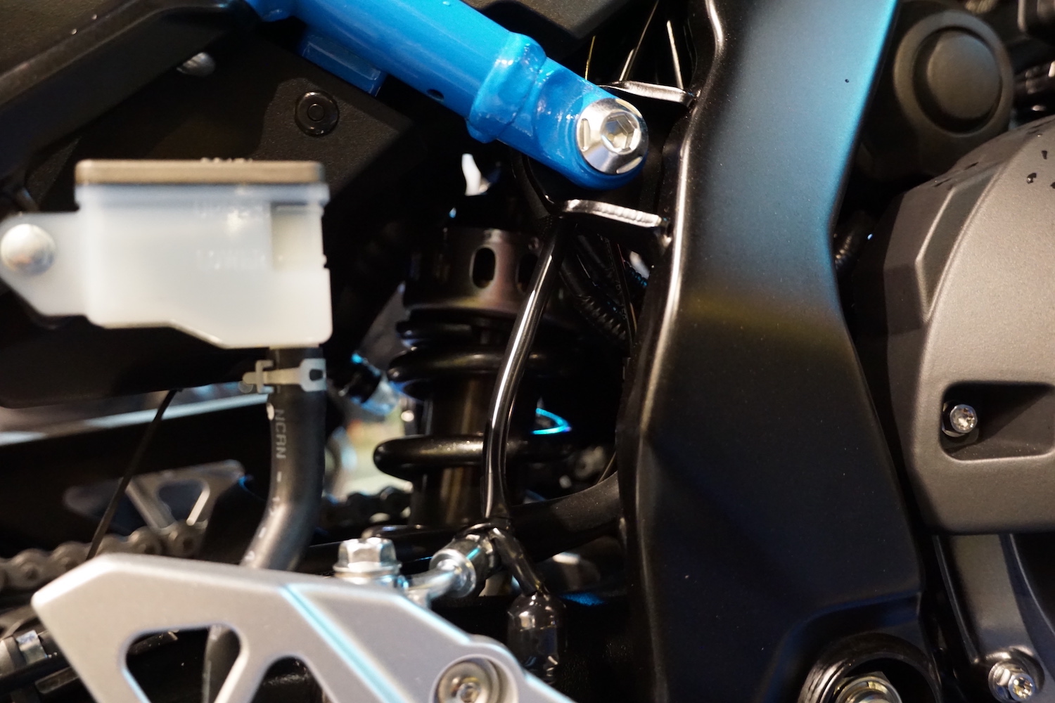 Sistem suspensi jenis fork terbalik (USD) KYB di depan, tetapi tidak boleh laras (depan) dan monoshock di belakang.