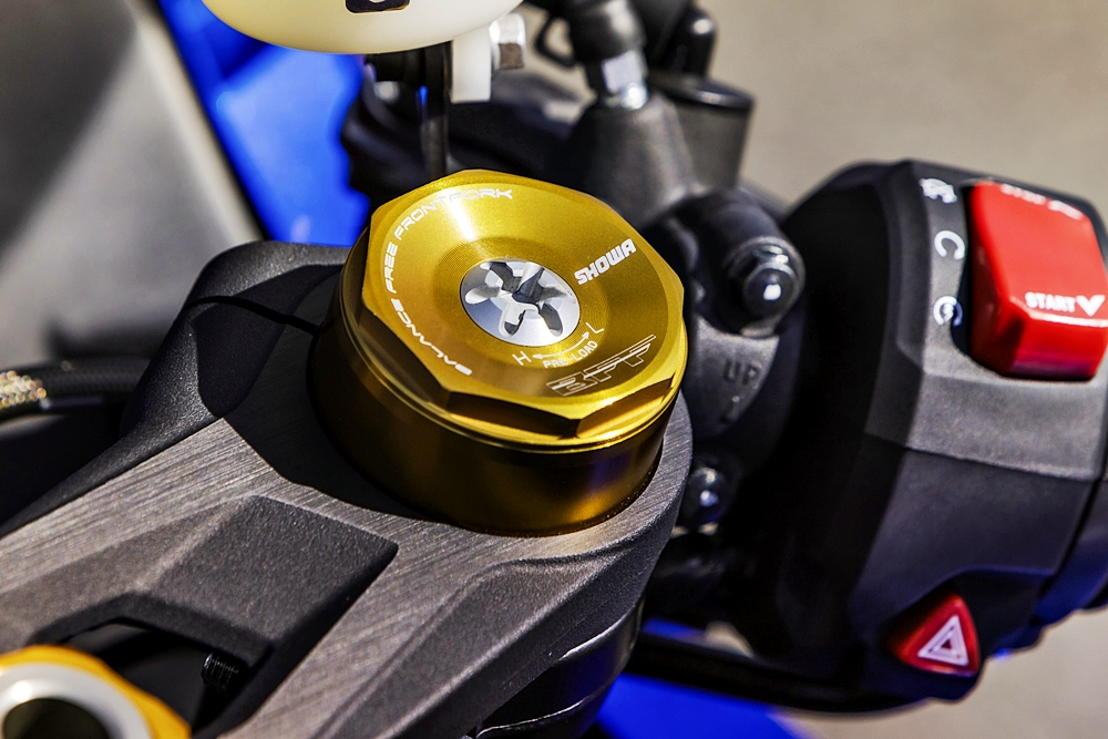 Sistem suspensi Showa menampilkan fork depan dan monoshock bebas imbang (balance free monoshock) serta damper hendal dikawal secara elektronik.