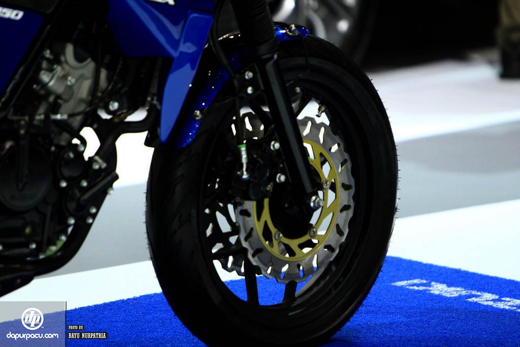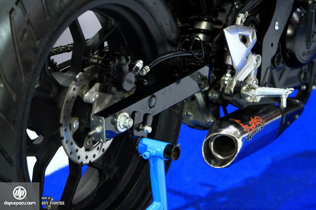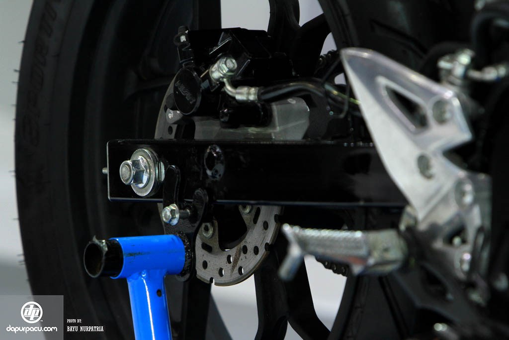 Insan Motor turut mengekalkan bahagian roda asal sambil menambah penutup supaya tampak tampak lebih ‘sado’. Rim pula menggunakan produk aftermarket bersaiz 4.5 inci di belakang dan 3 inci (depan) dengan tayar Aspira Premio 110/70-17 (depan) dan 160/60-17 (belakang).