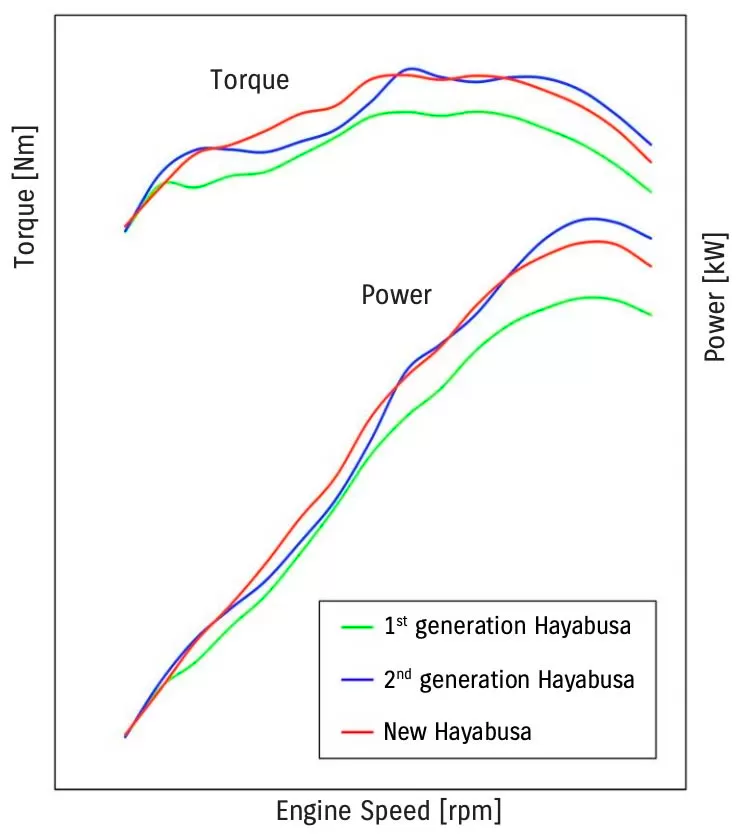 - Hayabusa (2021) serba baharu ini menawarkan lebih penjimatan bahan api berbanding dua model terdahulu. Angka kuasa dan tork sedikit dijinakkan berbanding model sebelum ini, tetapi mampu mencatatkan pecutan 0-100kmj sepantas (3.2 saat) berbanding dua model lama dulu. Kelajuan maksimum juga sama.
