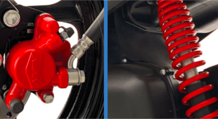Sistem brek jenis cakera di depan dan dram di belakang. Tayar digunakan daripada jenis tiubles dwi-guna. Jarak kelegaan tanah dikatakan tertinggi dalam kelas skuter, iaitu 150mm, manakala ruang simpanan ada dua kompartmen depan, dan lantai kaki direka nluas untuk keselesaan penunggang.