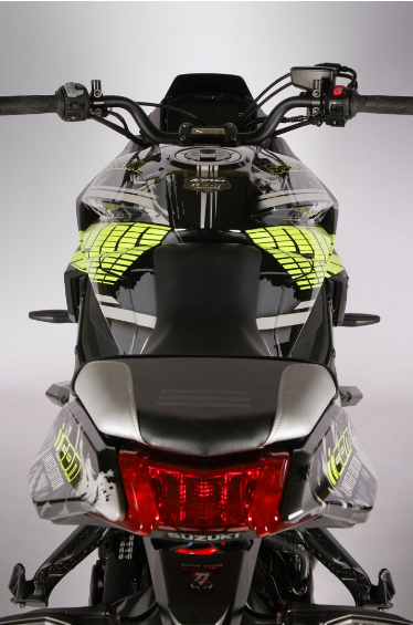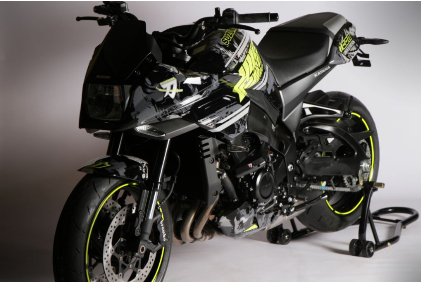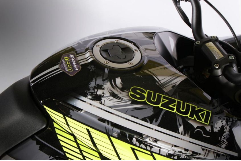 Seragam badan Katana menampilkan grafik kuning fluoresen dengan fon Icon tertera pada panel belakang motosikal. Rim hitam pula ditambahkan strip kuning padanan. Tambahan lain termasuk pemegang nombor plat lebih pendek yang disekalikan dengan lampu signal belok LED.