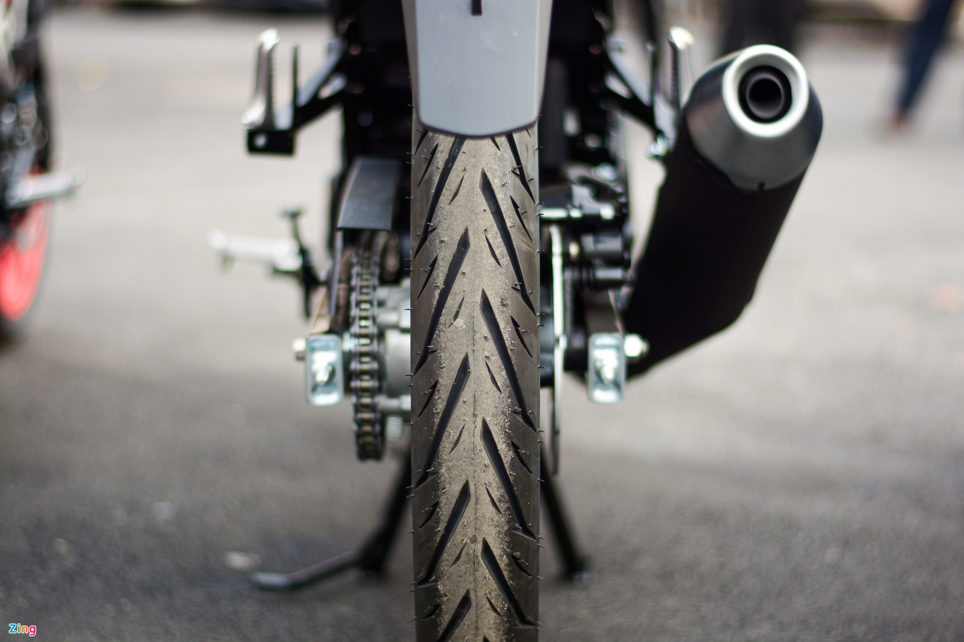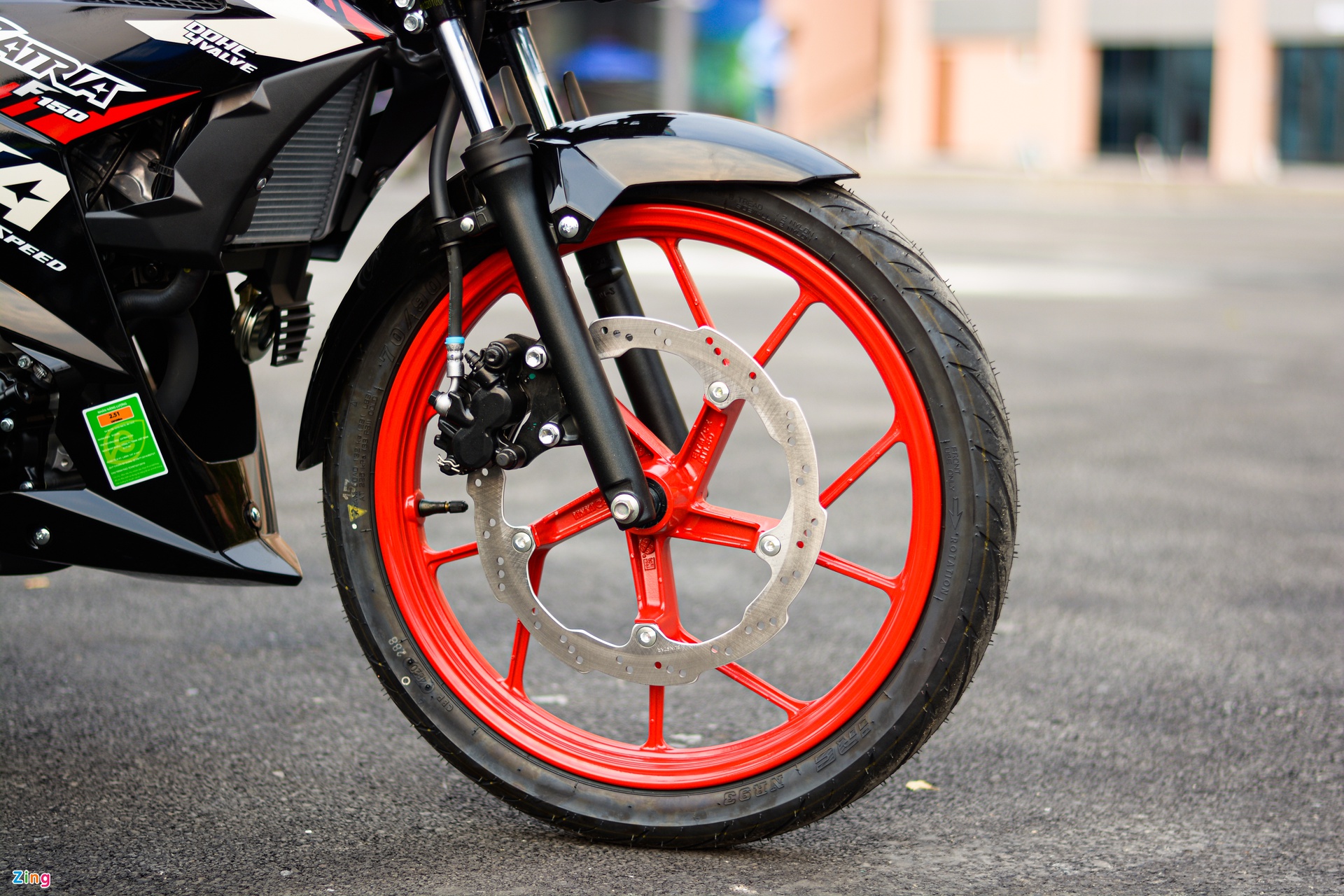 - Rekaan grafik Satria F150 sebenarnya mirip seperti Raider R150 (foto atas kiri), termasuk kemasan perak dan rekabentuk rim yang digunakan. Cuma berbeza pada grafik nama model itu, Satria F150 dan Raider R150. Menggunakan saiz tayar kecil, 70/90 di depan dan 80/90 di belakang, agak kurang sesuai untuk melakukn aksi melayan selekoh.
