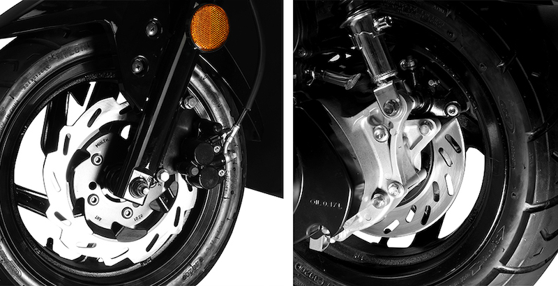 - Sistem suspensi depan kini nampak lebih tinggi untuk menyesuaikannya dengan identiti skuter adventure. Sistem sokongan belakang pula membabitkan absober berkembar boleh laras.