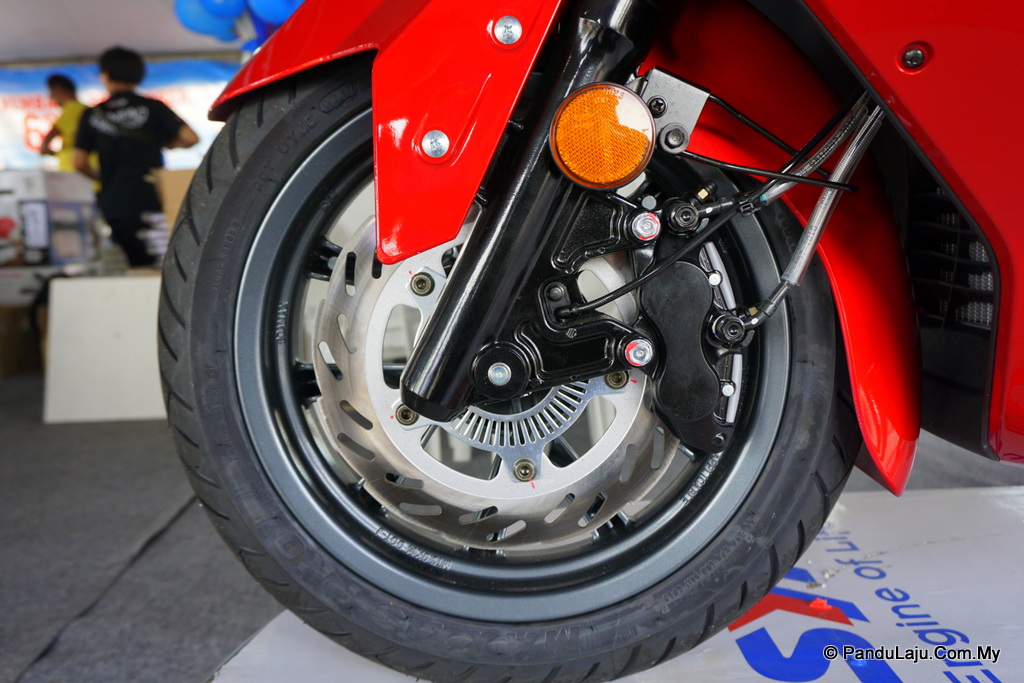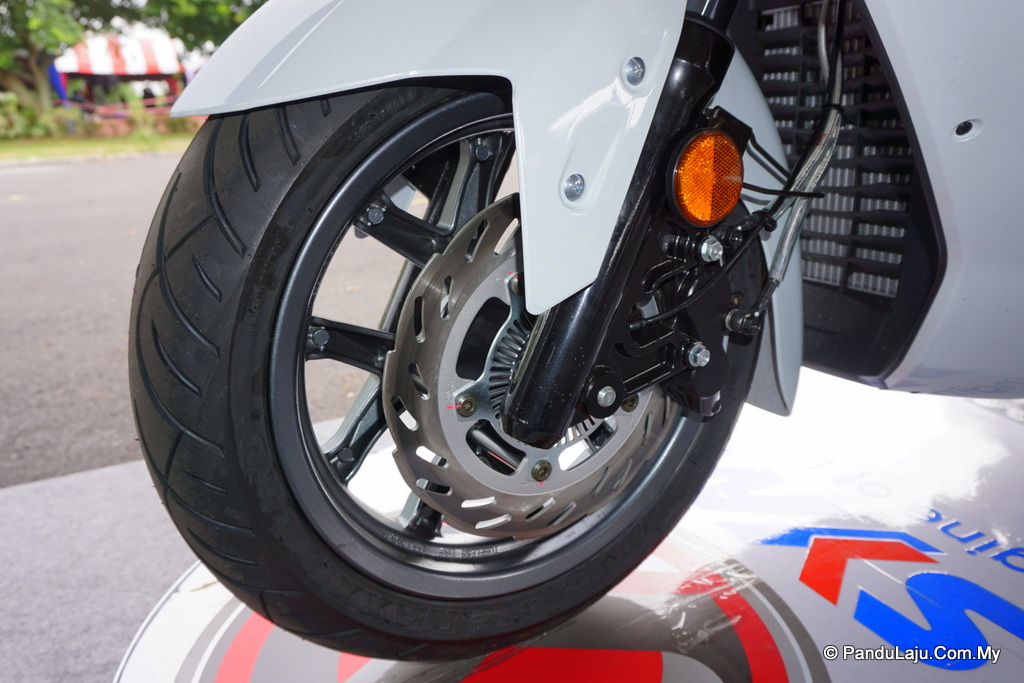 Keselesaan tunggangan diserahkan kepada fork teleskopik di depan dan unit swing di belakang. Saiz tayar depan 120/70-14 manakala belakang dipadankan dengan saiz 140/60-13.