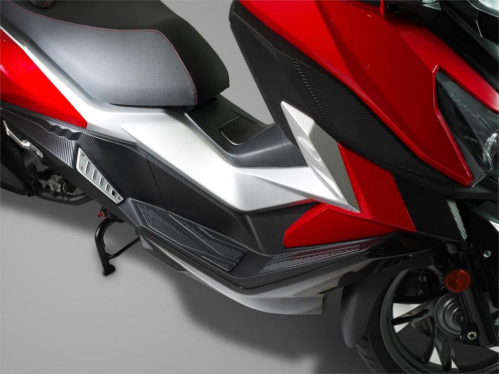 Hadir dengan rekaan futuristik, model skuter itu dilengkap dengan pelindung bercorakkan ‘carbon fiber’. Ia turut menampilkan sepasang lampu ‘fisheye’ yang diilhamkan daripada lampu LED ‘eyebrow’ SYM pada bahagian atas dan lampu belakang berbentukkan heksagon LED dengan 3D.
