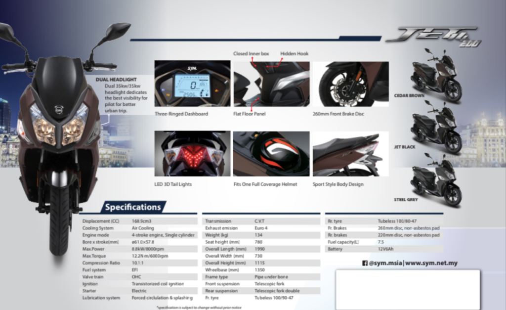 Jet 14 200 didatangkan dengan ciri khas seperti rekabentuk sporty, lampu belakang 3D LED, panel lantai rata, meter digital penuh 5 inci dan ruang simpanan yang boleh memuatkan helmet muka penuh. Ada tiga warna untuk dipilih: Cedar Brown (coklat), Jet Black (hitam) dan Steel Grey (kelabu) pada harga asas RM7,888.