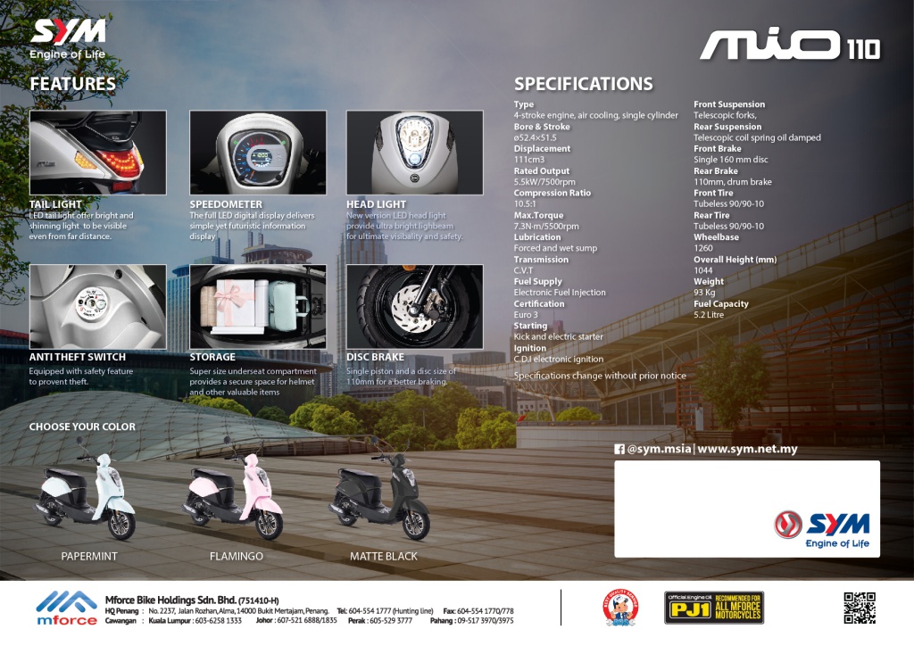 Mio 110 ditawarkan dalam pilihan warna Papermint, Flamingo, Matte Black pada harga RM5,688. Dimensi badan memiliki panjang 1,764mm, lebar 685mm dan tinggi 1,044mm serta jarak roda (1260mm).