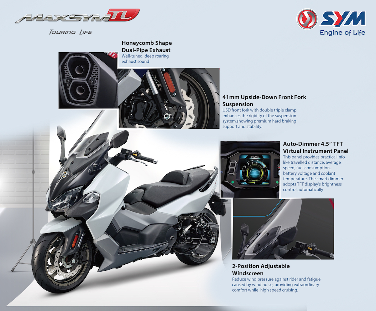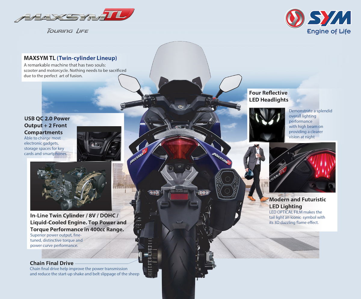 MAXSYM TL ialah skuter dwi-silinder pertama SYM yang dijana enjin 465cc DOHCpenyejukan cecair dengan sistem suntikan bahan api (FI) berkuasa 40.2hp @ 6750rpm dan tork 42.5Nm @ 6250rpm. Dipacukan sistem pacuan rantai, hantaran kuasa skuter ini disalurkan menerusi kotak gear CVT. Skuter ni juga patuh emisi Euro4.