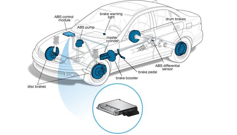 - Setiap roda kereta dengan ABS dipasangkan sensor halaju untuk mengukur kadar pergerakan. Maklumat kelajuan roda kemudian akan dihantar ke sistem komputer dan ABS.