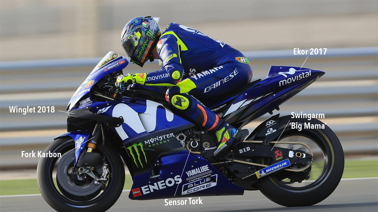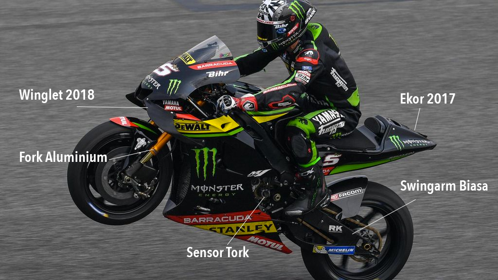 Jentera digunakan pasukan factory (Movistar Yamaha MotoGP) ialah YZR-M1, manakala pasukan satelit (Monster Yamaha Tech3) pun menggunakan jentera sama, YZR-M1. Tetapi apa bezanya? Lihat ringkasan bergambar di bawah: