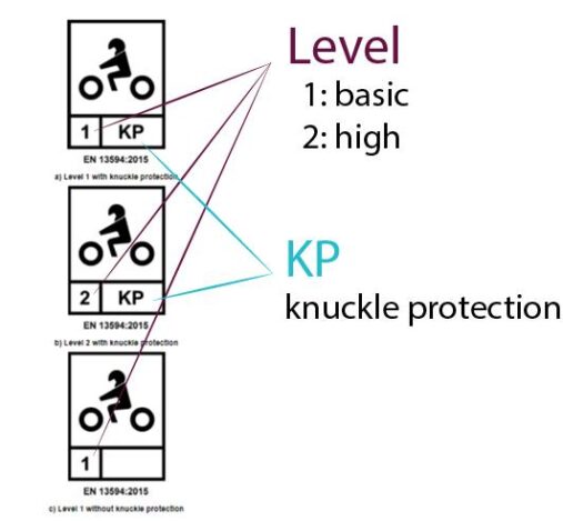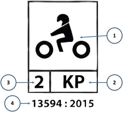 - Tanda ‘KP’ dalam kotak bermaksud ‘Knuckle Protection’ (perlindungan buku lima), iaitu sarung tangan tersebut menawarkan perlindungan pada buku lima penunggang. Ingat, bukan semua sarung tangan mempunyai pelindung buku lima dengan penarafan ‘KP’.