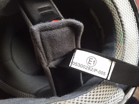 - E1 dalam bulatan (foto atas paling kiri): Ini kod negara di mana helmet itu diuji dan diluluskan. E1 bermaksud diuji dan diluluskan di makmal Jerman. Ada juga nombor lain seperti E2 untuk Perancis, E3 (Itali) dan lain-lain. Ada juga kod untuk negara bukan Eropah seperti E43 (Jepun), E45 (Australia), E47 (Afrika Selatan), E48 (New Zealand).