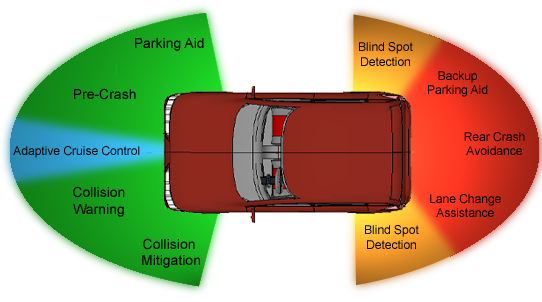 Dalam dunia automotif pula, ciri sama diperoleh menerusi pemasangan sensor radar pada sudut badan kenderaan yang berfungsi mengesan objek di setiap sudut kawasan. Bagaimanapun, radar tidak dapat mengenal pasti dan membezakan jenis kenderaan dan objek.