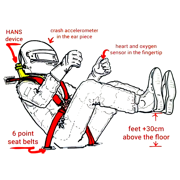 Rekabentuk kerusi F1 juga direka untuk memberikan perlindungan pada kepala, leher dan tulang belakang pelumba.