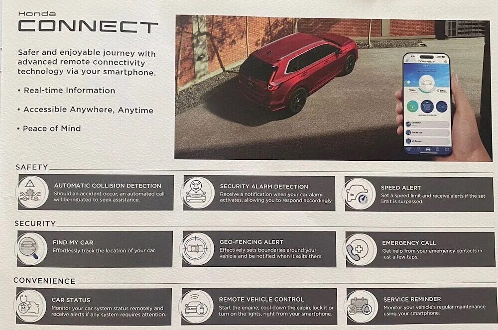 - Juga diperkenalkan aplikasi Honda CONNECT sebagai tambahan ciri keselamatan menerusi telefon pintar untuk akses status kereta, kawalan jarak jauh seperti fungsi menghidup dan mematikan enjin , dan penggilan kecemasan automatik jika berlaku kemalangan.