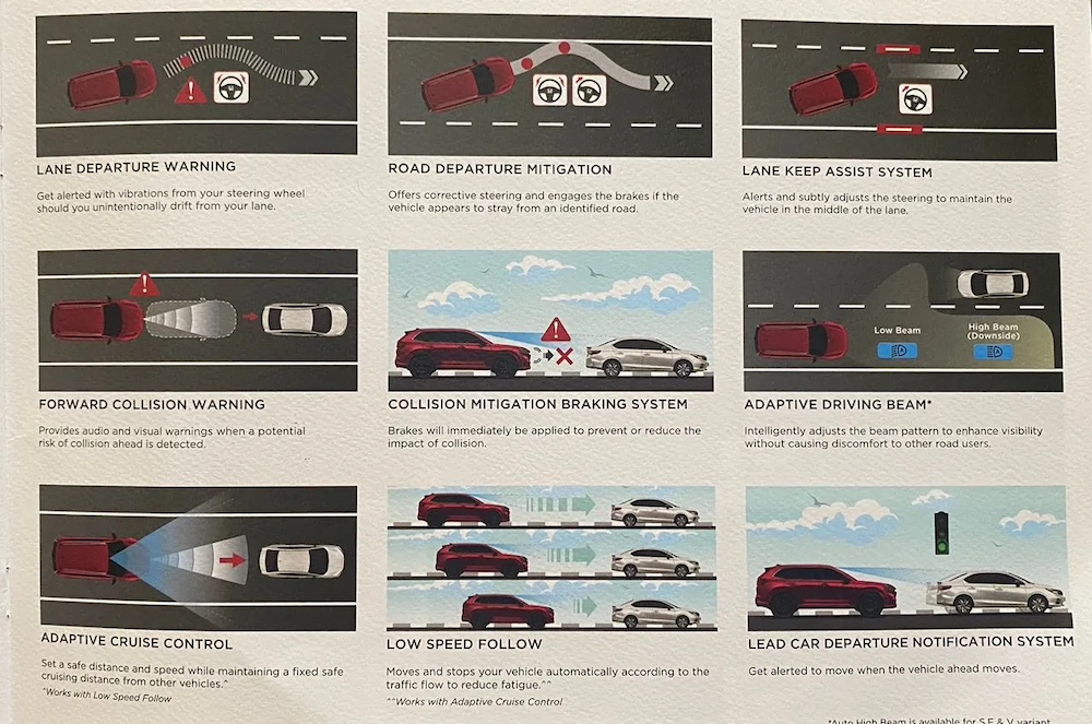 - Teknologi bantuan pemandu termaju (ADAS) Honda SENSING dilengkapi ciri Brek Kecemasan Autonomi (AEB), Lampu Suluh Tinggi Automatik (AHB), Kawalan Jelajah Adaptif (ACC), dan Amaran Keluar Lorong (LDW).