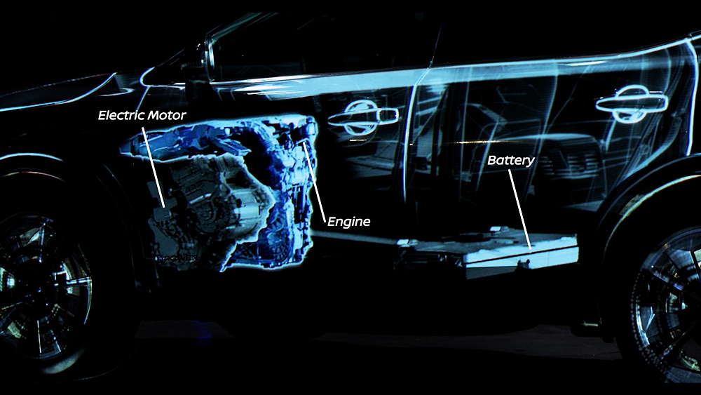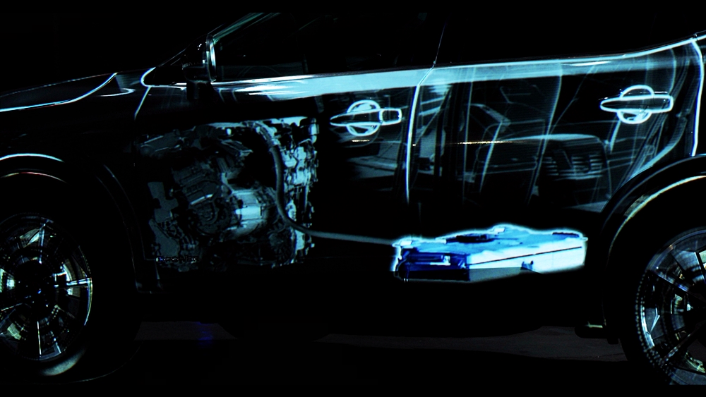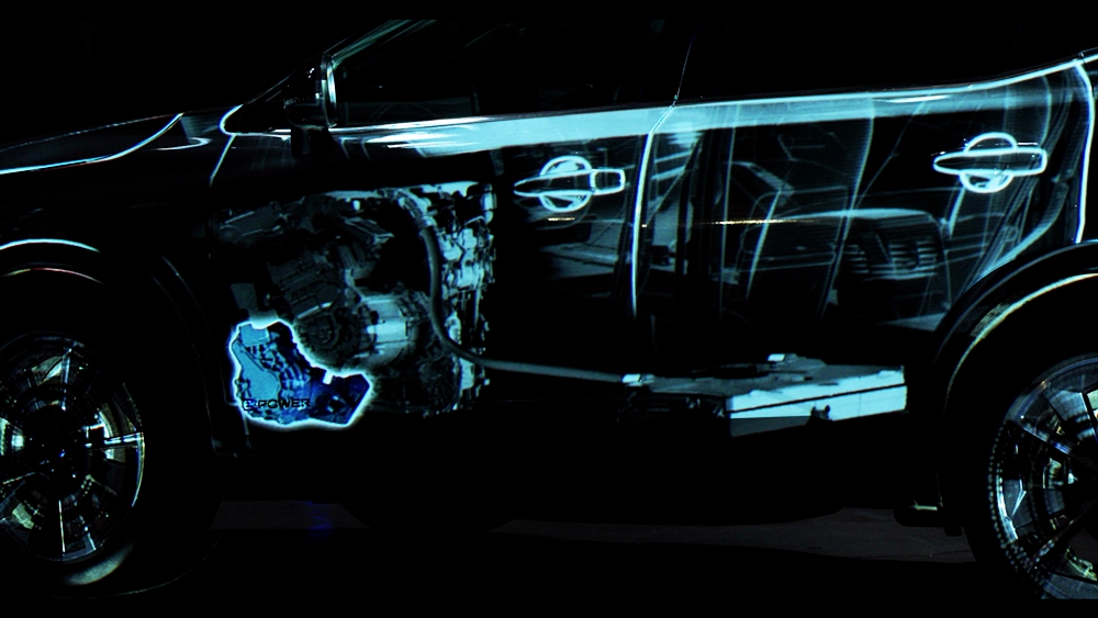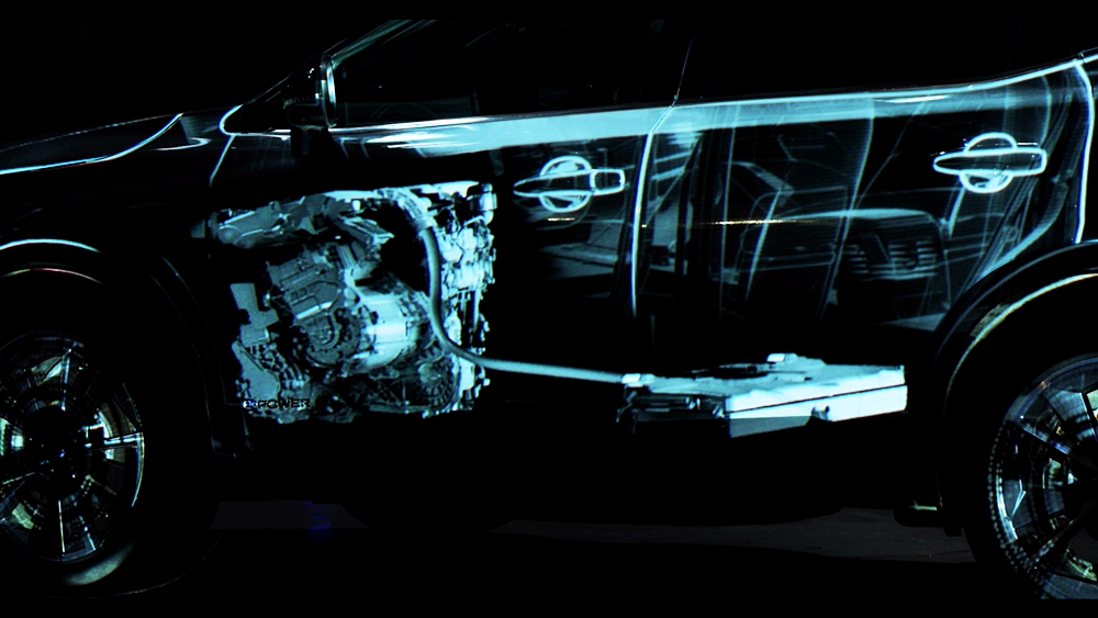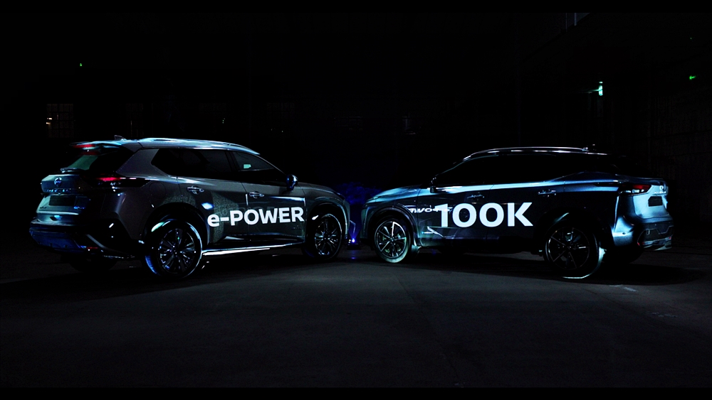 Rekaan digital itu menjadikan dua model sebagai kanvas dan menggunakan pancaran anamorfik bagi memperinci operasi e-POWER.