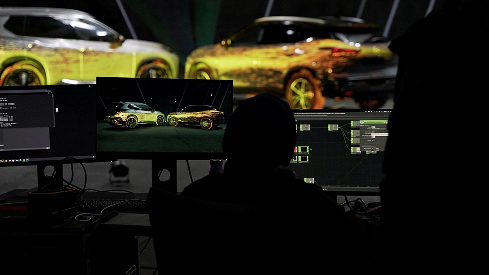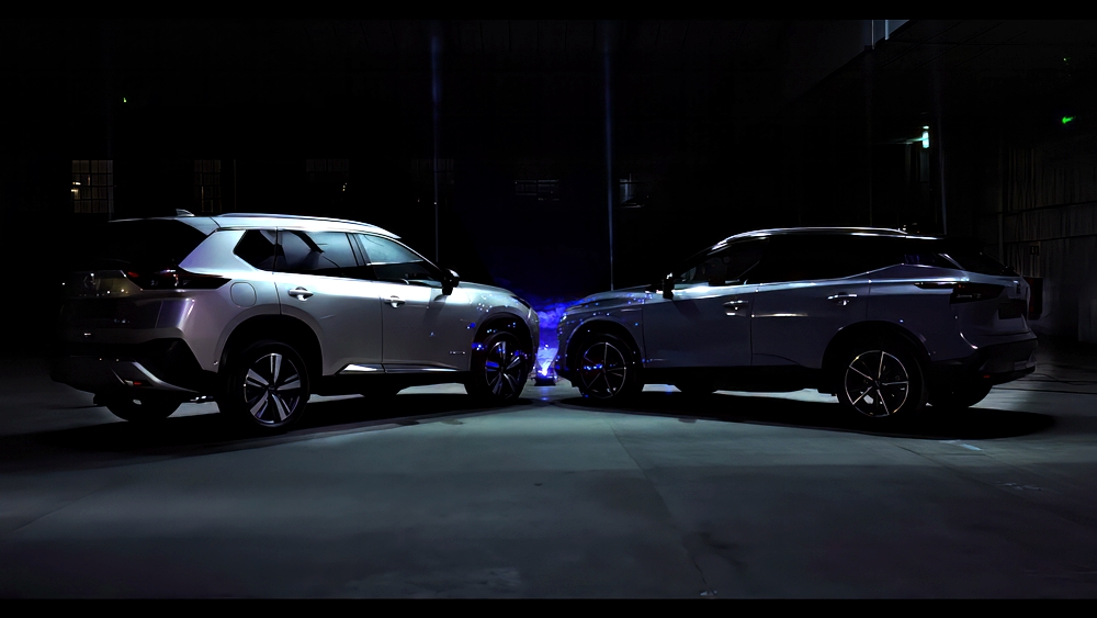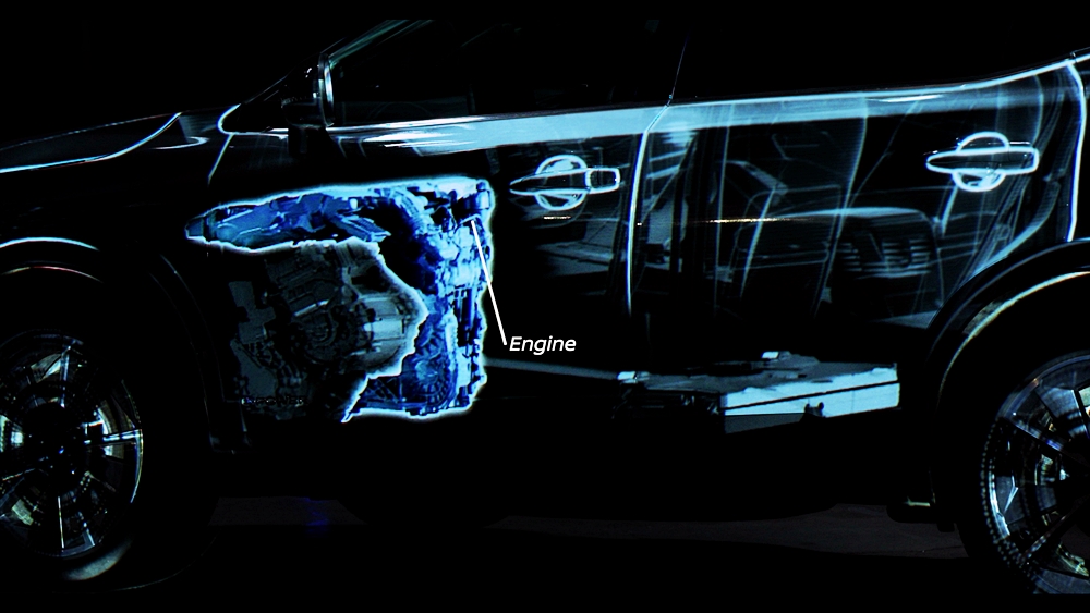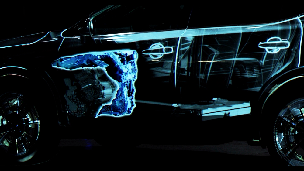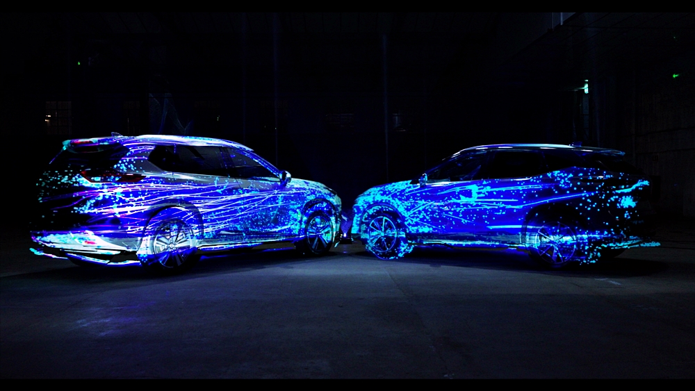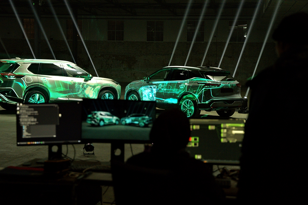 Rekaan digital itu menjadikan dua model sebagai kanvas dan menggunakan pancaran anamorfik bagi memperinci operasi e-POWER.