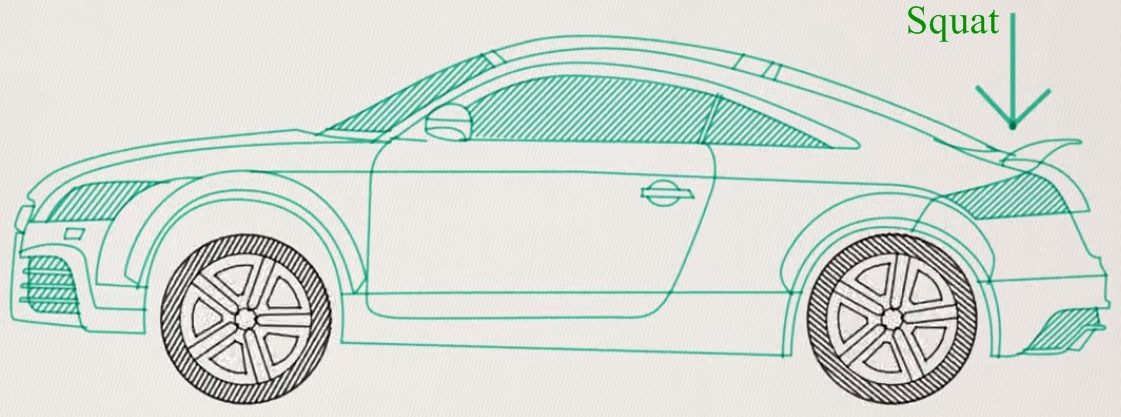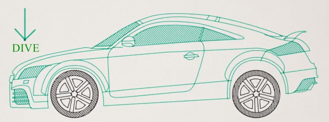 Ketiga, ini berkaitan perubahan keadaan kereta. Apakah dimaksudkan perubahan keadaan kereta? Jawapannya, keadaan ketika kereta menjunam (dive) atau menjongket (squat). Perubahan ini biasanya berlaku ketika kereta hendak berhenti (menjunam) dan memecut awal (menjongket). Cuba lihat gambarajah di bawah untuk pemahaman lebih jelas.