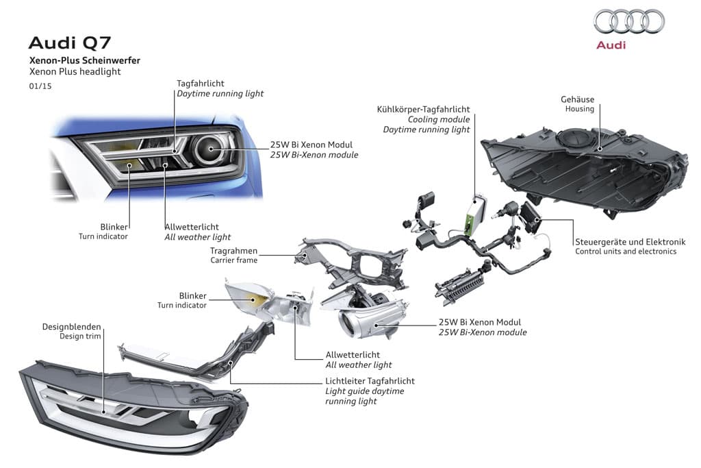 Lihat gambar di atas. Itu ialah sistem lampu depan Audi, dipanggil ‘Junction Light’ yang menggunakan modul bi-xenon 25W. Seperti diterangkan sebelum ini, ada pemegang atau frem yang memegang unit projektor untuk menggerakkan dan memusingkan lampu ke arah sasaran suluhan. Sistem lampu depan adaptif Audi ini boleh mengubah bentuk suluhan cahaya mengikut keadaan jalan di bandar, kampung atau lebuh raya.