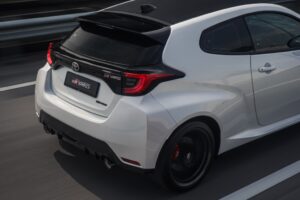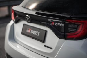 - Bahagian belakang GR Yaris mendapat sentuhan bumbung tiru dengan pilar belakang disempurnakan spoiler GR tinggi untuk meningkatkan daya mendap (downforce) keseluruhan.