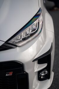 - Rekabentuk depan GR Yaris menampilkan rupa garang dan mengancam yang menyerlahkan identiti kompetitif.