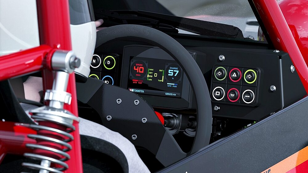 Tamiya Wild One MAX Launch Edition dilengkapi kerusi lumba Cobra dengan tali keledar 4-poin, skrin digital 5 inci gred IP dan juga suis kalis air (marine spec).