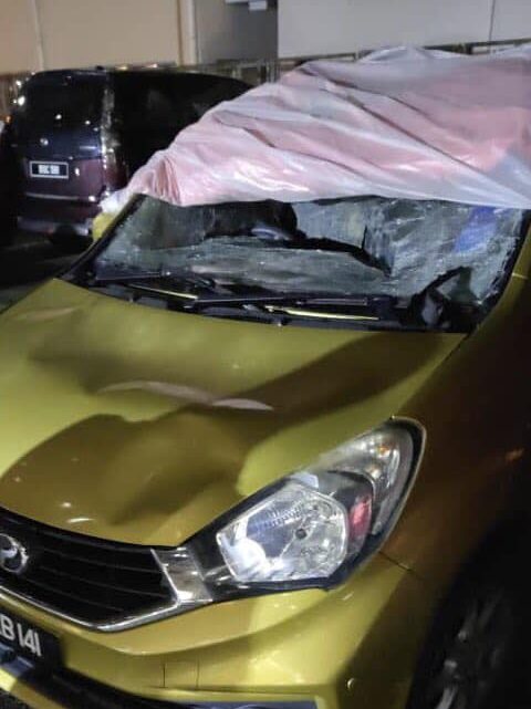 Tangki air yang berada pada ketinggian 18.5 meter itu turut menyebabkan serpihan tangki pecah turut jatuh. Difahamkan antara kerosakan dialami adalah cermin depan pecah dan kemik.