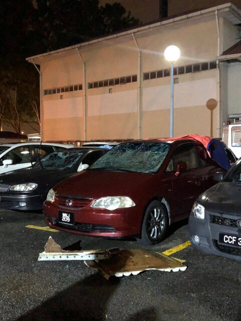 Tangki air yang berada pada ketinggian 18.5 meter itu turut menyebabkan serpihan tangki pecah turut jatuh. Difahamkan antara kerosakan dialami adalah cermin depan pecah dan kemik.