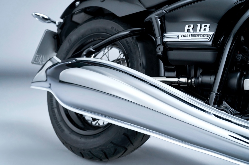 2. BMW R18 klasik yang berkapasiti besar itu menampilkan logo First Edition dengan gubahan jalur halus berlatarkan warna hitam berkilat bagi menyerlahkan gaya dan sensasi tiada bandingan. Aura cruiser diserlahkan dengan bar hendal, tuil penukar gear, pelindung hendal, kepala silinder, engkol, serta komponen ambilan kemasan krom.