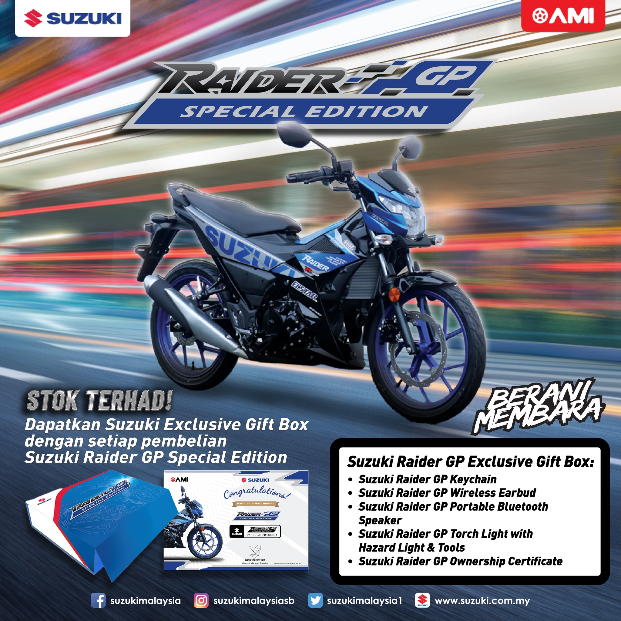 Menurut Suzuki Malaysia, setiap pembelian Suzuki Raider GP Special Edition (2023) akan menerima hadiah Suzuki Exclusive Gift Box yang mengandungi: