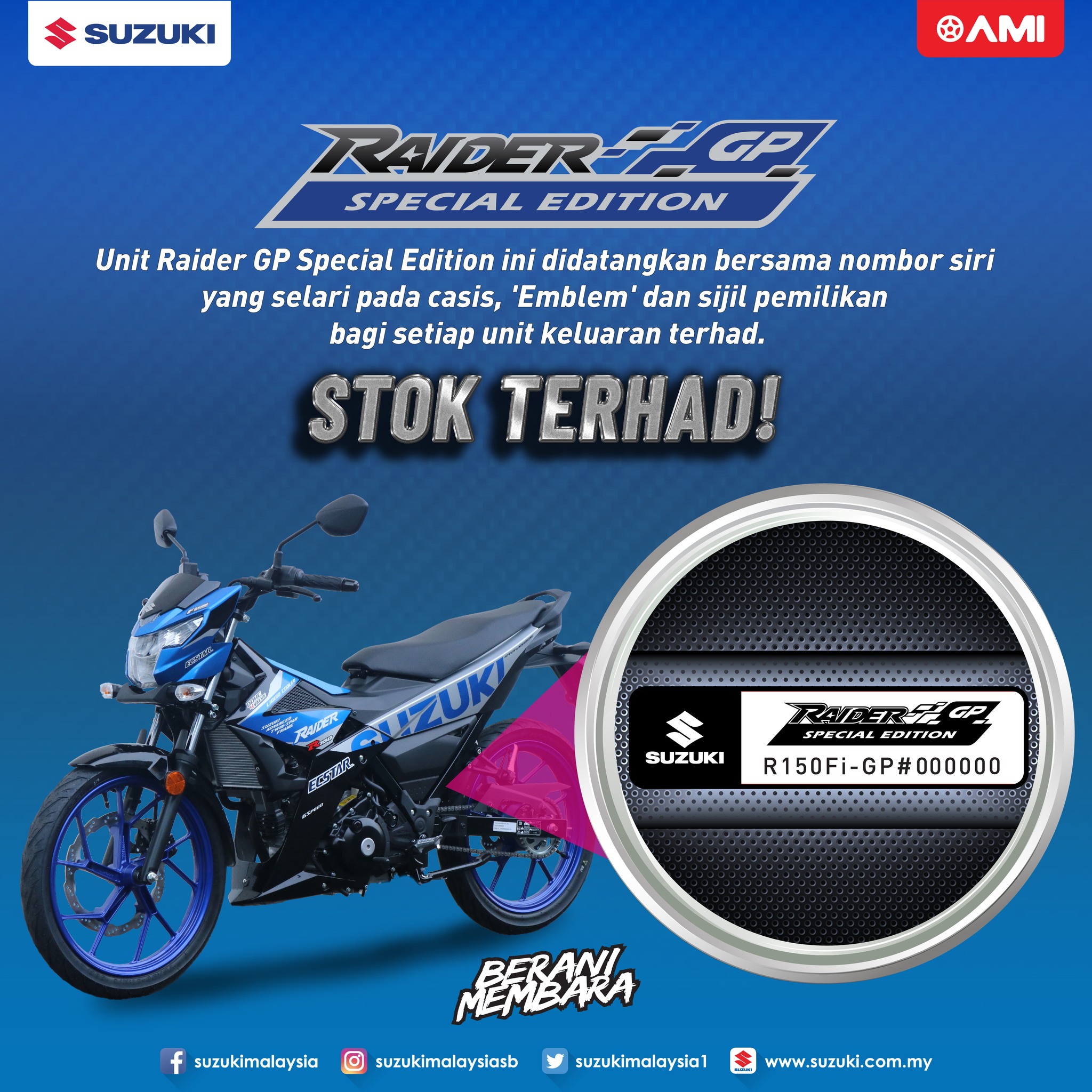 SUZUKI Malaysia mengumumkan kehadiran Suzuki Raider GP Special Edition (2023) dengan tempahan boleh dibuat menerusi rangkaian pengedar. Bagaimanapun, belum ada maklumat mengenai harga jualan disyorkan.