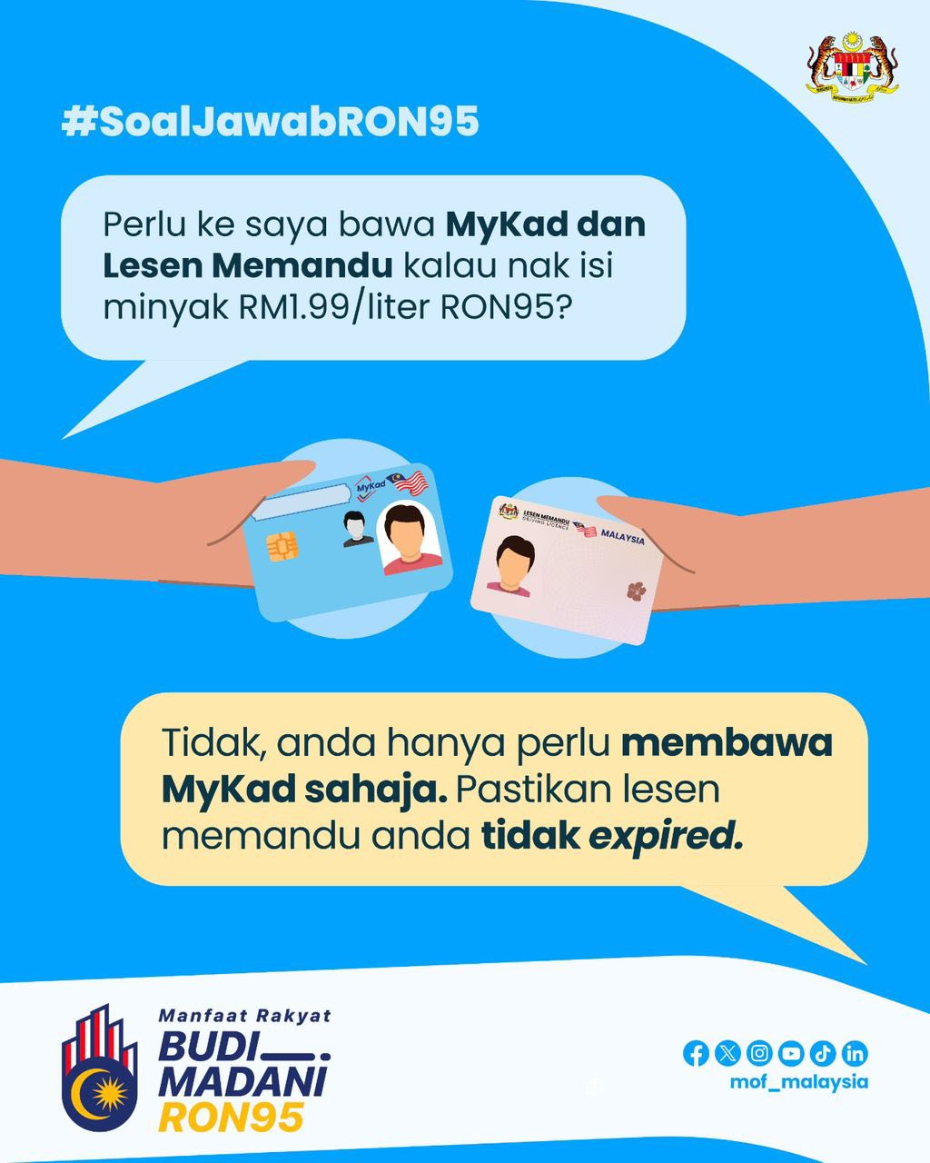 - Cuma perlu bawa kad pengenalan (MyKad) kalau mahu mengisi RON95 pasa harga subsidi RM1.99 seliter. Tidak perlu lesen memandu, cuma pastikan tidak tamat tempoh.