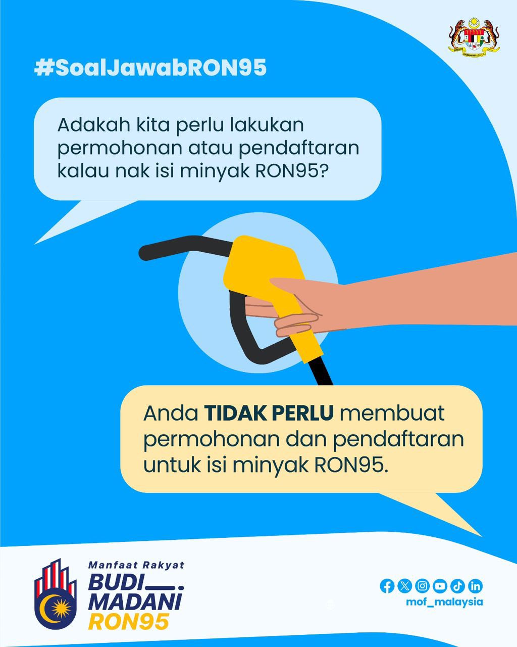 - Tidak perlu buat apa-apa permohonan atau pendaftaran untuk mengisi RON95 sama ada sebelum atau selepas jika hendak mengisi minyak.