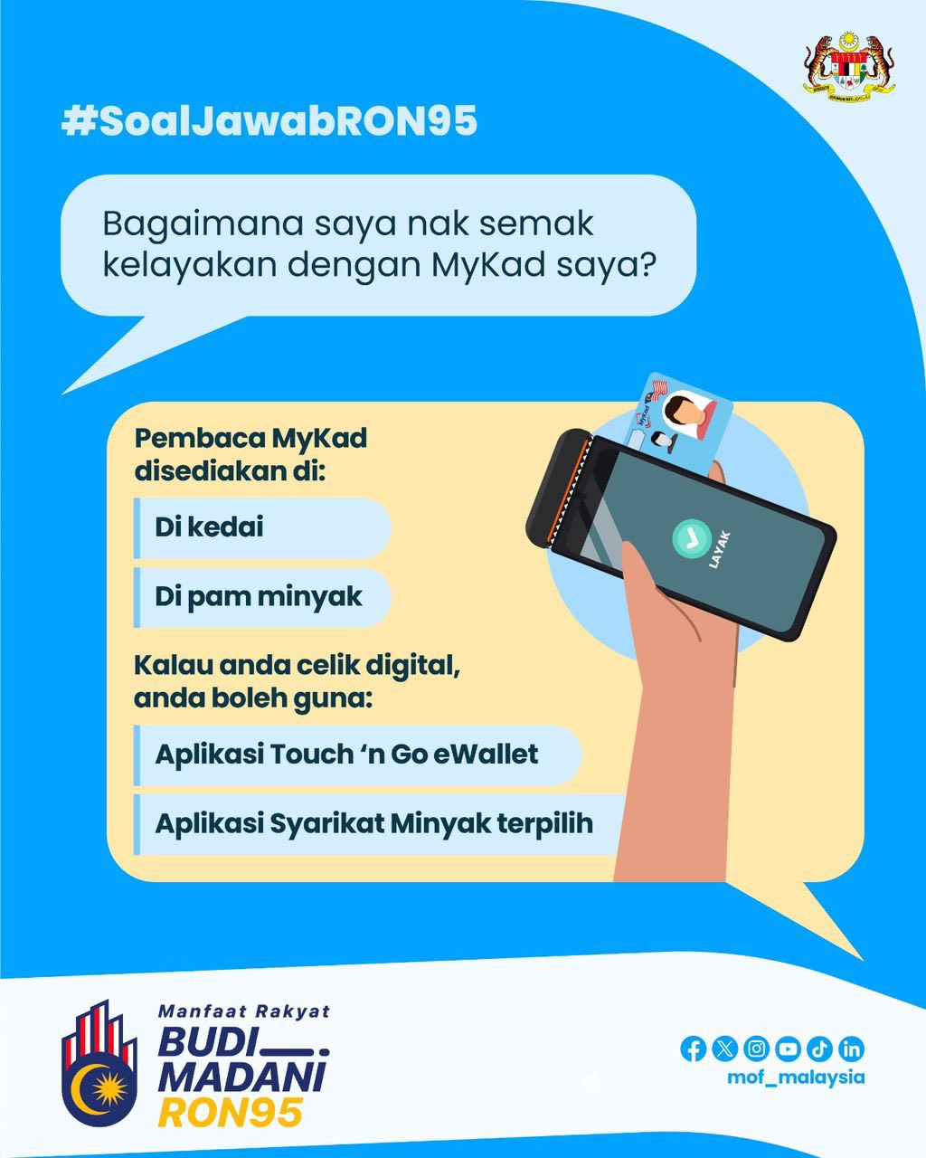 - MyKad cuma diperlukan untuk menyemak kelayakan ketika hendak membuat pembayaran RON95.