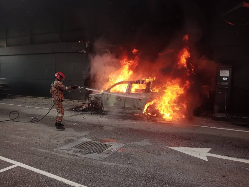 Kebakaran turut memusnahkan 20 peratus kawasan pengecasan kenderaan elektrik (EV) di depan kereta terbakar berkenaan.