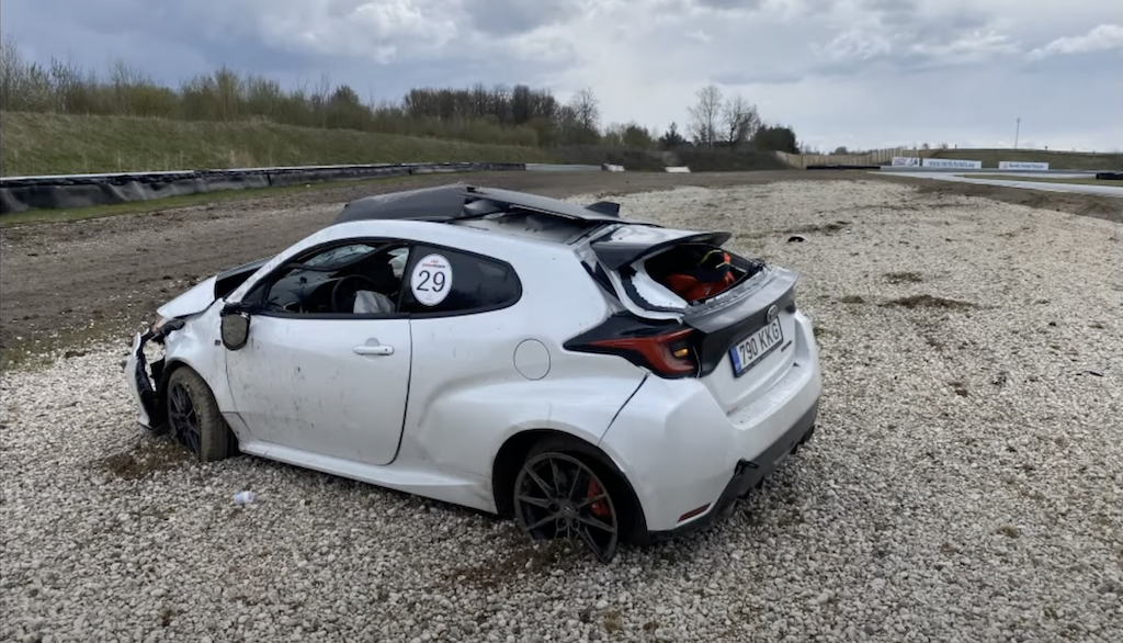 GR Yaris putih itu dilihat meluncur laju memasuki selekoh, tetapi gagal dikawal apabila keluar dari selekoh tersebut sebelum terbabas ke pasir dan tunggang terbalik kira-kira empat kali sebelum berhenti. Tidak diketahui apa nasib menimpa pemandu tersebut, tetapi berdasarkan foto didedahkan, dipercayai si tuan kereta masih selamat.