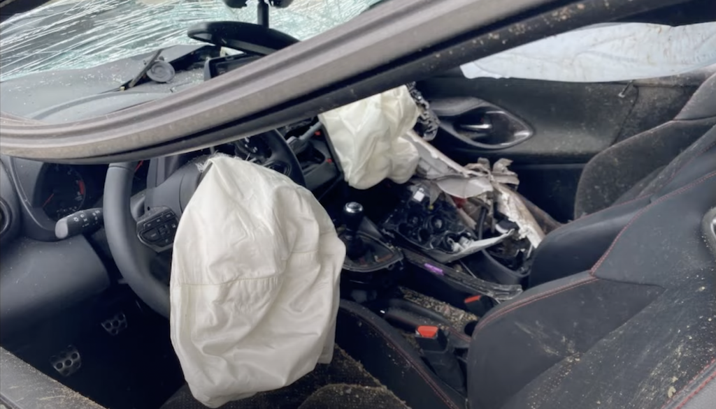 Walaupun bahagian luaran remuk teruk, terutama sebelah kanan, tetapi ruang kabin masih dalam keadaan baik yang jelas menunjukkan kereta ini mempunyai tahap keselamatan terbaik.