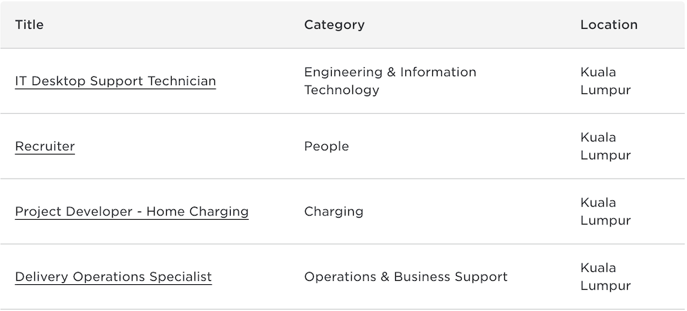 Iklan jawatan kosong itu melibatkan bahagian khidmat pelanggan, operasi, jualan, pengecasan dan kejuruteraan serta teknologi maklumat. Ada sembilan kekosongan disiarkan dalam laman web Tesla yang semua berjawatan TETAP.