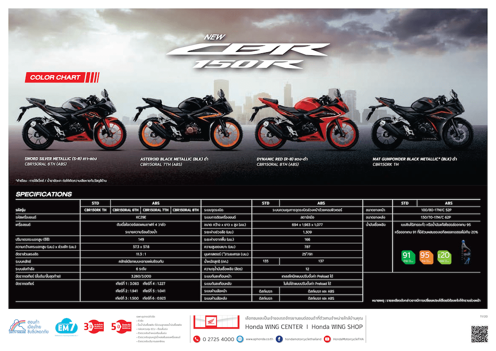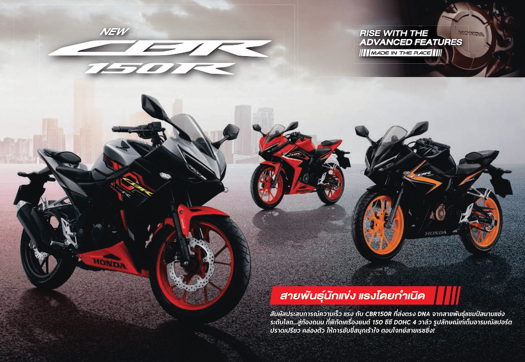 AP HONDA baru saja melancarkan CBR150R (2020) untuk pasaran Thailand yang didatangkan dalam empat pilihan warna baharu diilhamkan daripada model abang besar, CBR650R dan CBR1000RR-R, pada harga 99,700 baht (RM13,500).
