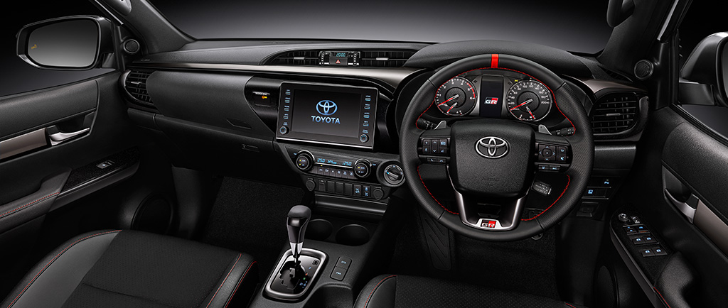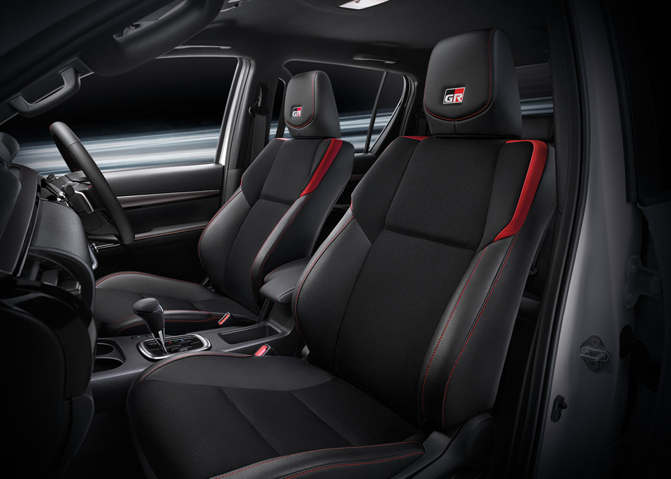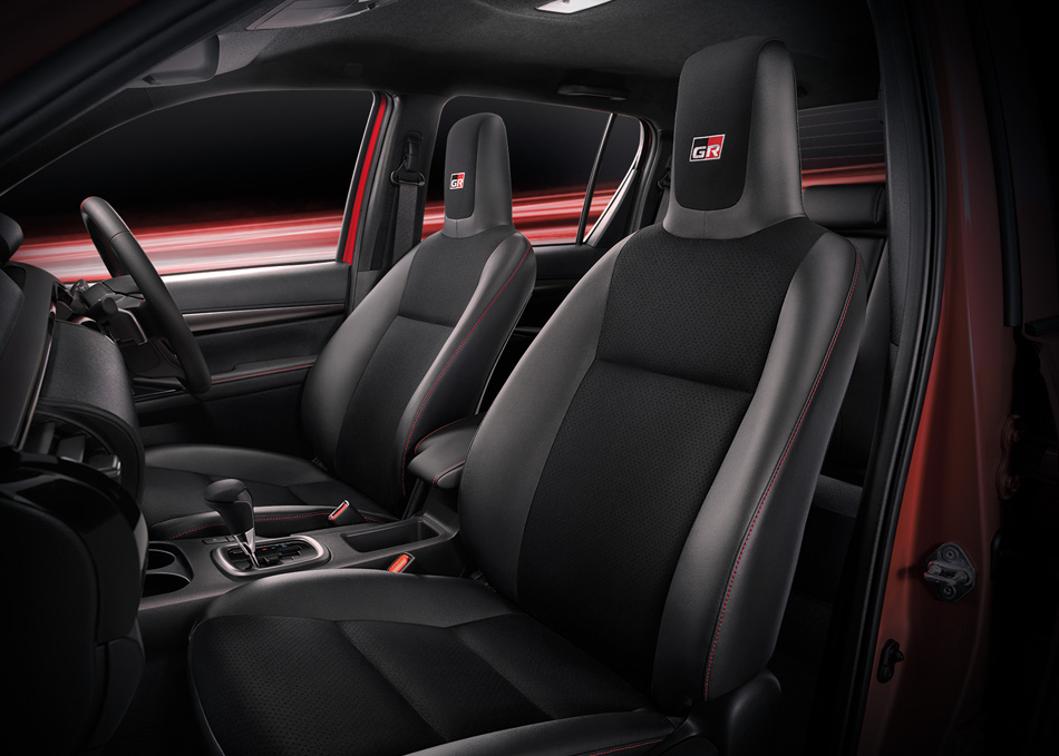 - Ruang kabin menggunakan kemasan upholsteri kulit fauks/ sued dengan sulaman benang merah, manakala kerusi sport GR disepadukan dengan penyandar kepala untuk ekstra sokongan.