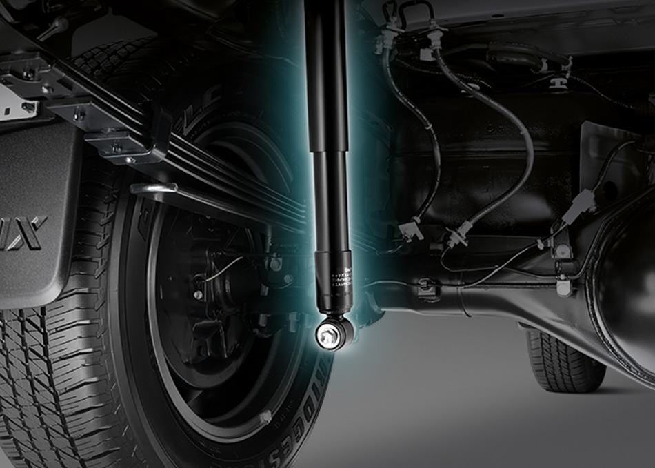 - Sistem suspensi menggunakan unit double wishbones dengan spring koil SuperFelx Suspension dan bar stabiliser di depan dan spring dedaun (leaf) 5 keping Monotube Shock Absorber di belakang.