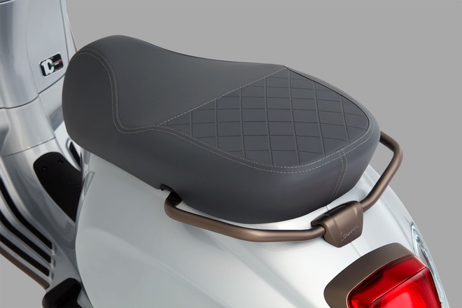 Pelana menggunakan materialb kulit kelabu dengan sulaman corak berlian. Bagi memastikan tona kontras, Vespa mengenakan sentuhan tembaga membabitkan trim pada panel fairing depan, frem lampu depan, pengadang meter, bar hendal belakang dan rim.
