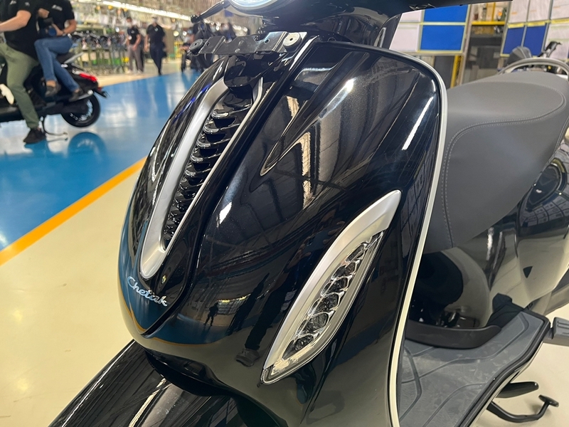 - Chetak Electric didatangkan dengan kit pengecas yang disimpan dalam ruang panel depan skuter.