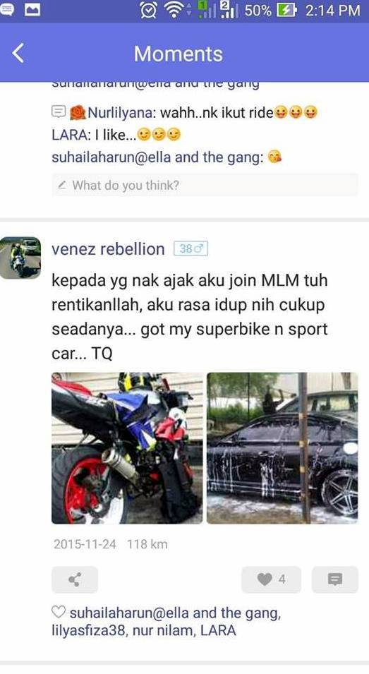 Aku ada dua kawan lagi yang nyaris kena game dengan Venez. Sebab aku sudah terkena, depa tak jadi deal. Baru-baru ini, bateri kereta bini aku kong, aku pegi jumpa bini aku bawa motor tanpa lesen sejauh 30km sehala. Boleh bayangkan tak macam mana perasaan aku masa itu? Kalau aku kemalangan sudah satu hal, kalau ada operasi lagi satu hal dan kalau kena tangkap memang punah hidup aku!