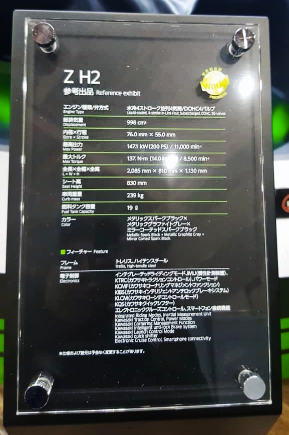 Berdasarkan spesifikasi yang tertera pada panel spesifikasi, Z H2 dijana enjin 4-lejang 16 injap 4 sebaris bersesaran 998cc DOHC penyejukan cecair yang mampu meledakkan kuasa setinggi 198hp (200ps) @ 11,000rpm dan tork 137Nm @ 8,500rpm.